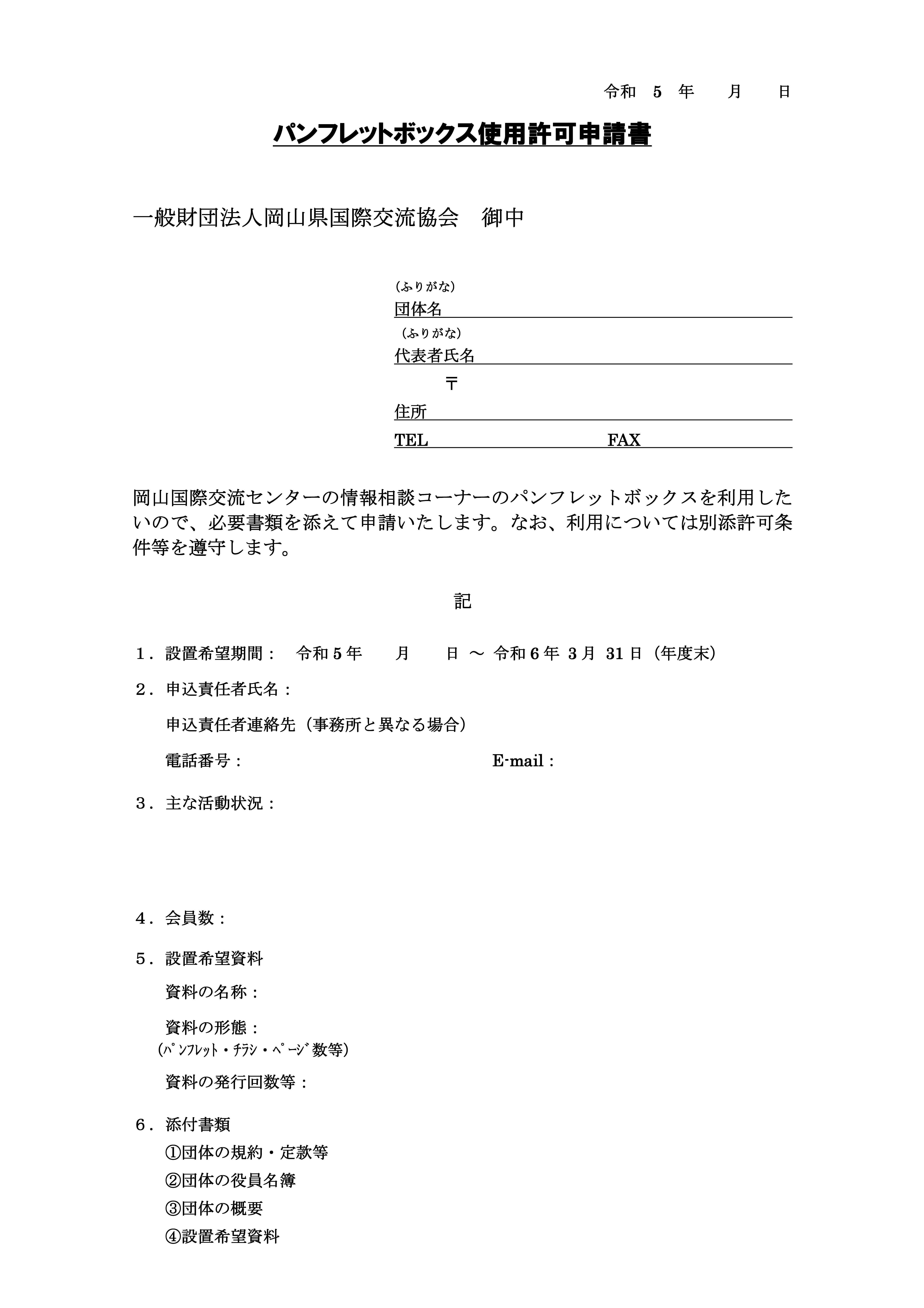 パンフレットボックス使用許可申請書(NGO・NPO)