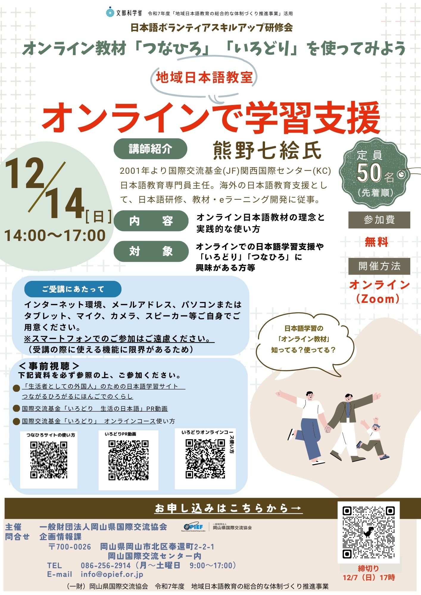 | 問合せ | 企画情報課 電話 086-256ー2914(月~土 9~17時) メール info@opief.or.jp