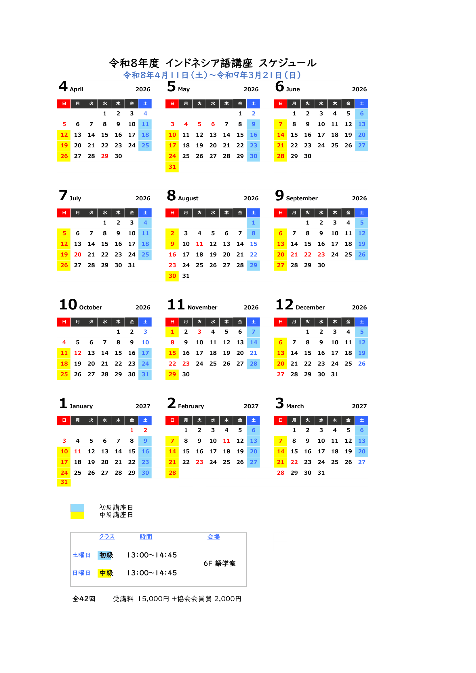 | と き | 土曜日 13:00~14:45 初級 4月11日(土)から開講。 日曜日 13:00~14:45 中級 4月12日(日)から開講。 |