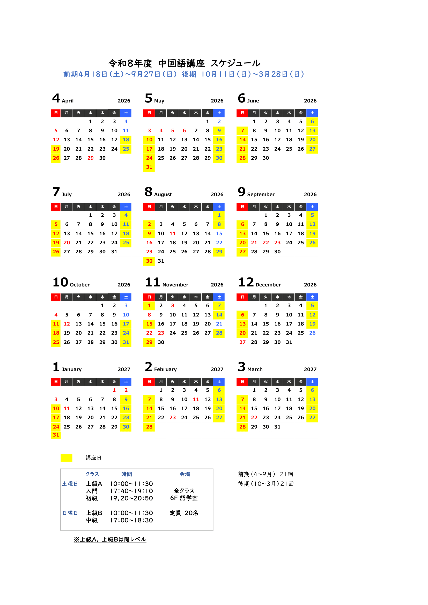 中国語講座は前期<4月~9月>と 後期<10月~3月> に分かれ、1年で全42回あります。